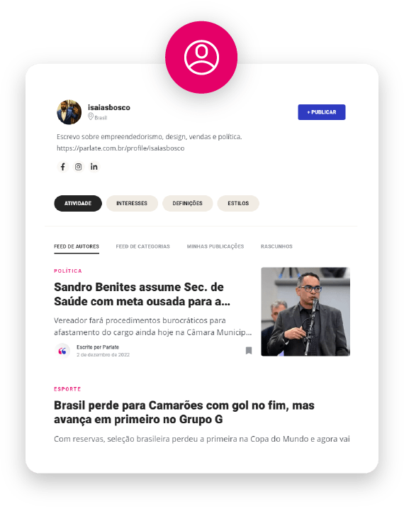 Personalize seu avatar e capa, faça publicações, siga autores e amigos, marque seus posts favoritos, defina temas de interesse preferencial no feed, o canal é seu, não se esqueça.